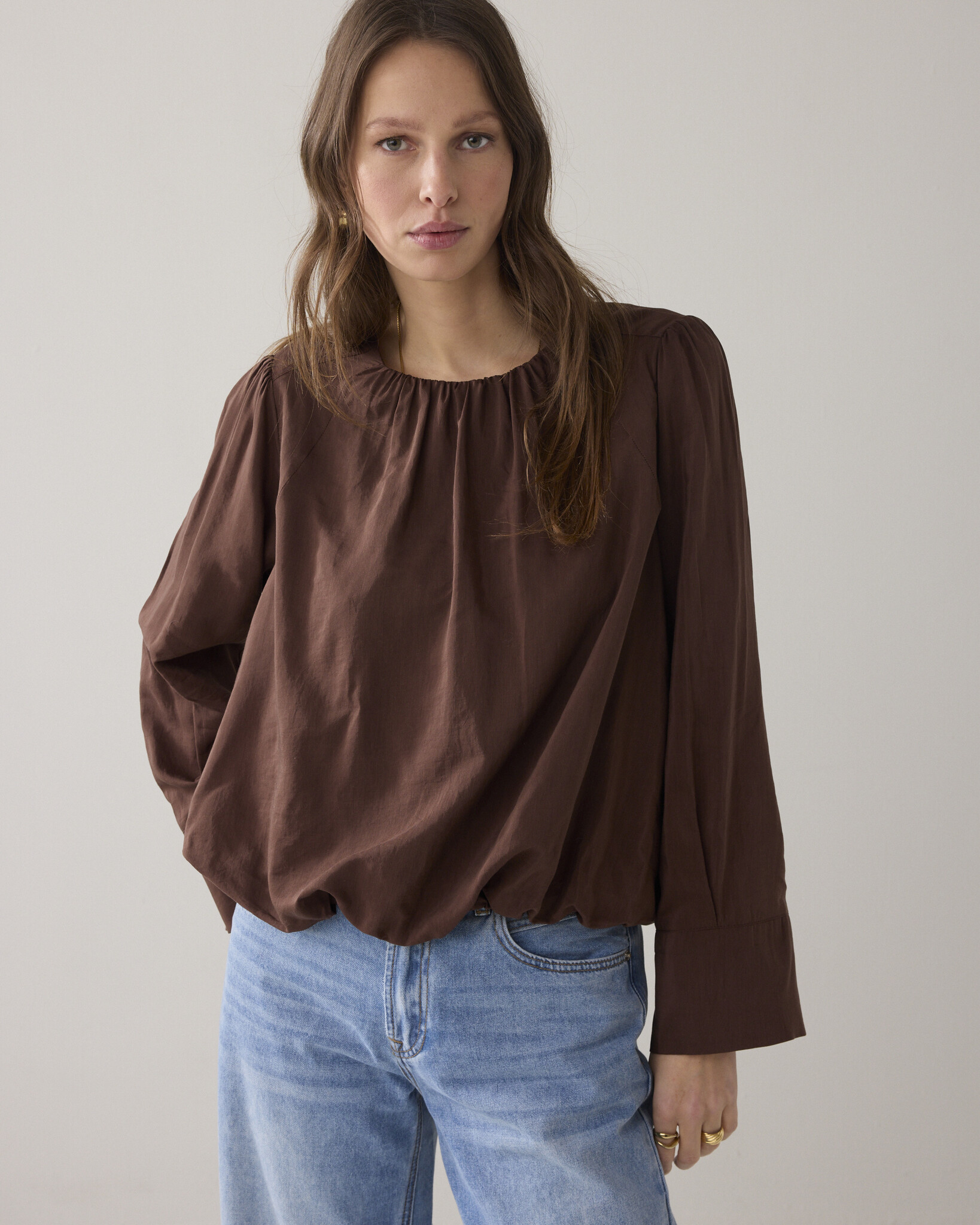 Gevoerde, lichtglanzende top met een aangerimpelde halslijn en zoom. De top heeft nonchalante ballonmouwen met brede manchetten met split en een stoffen striksluiting in de nek.