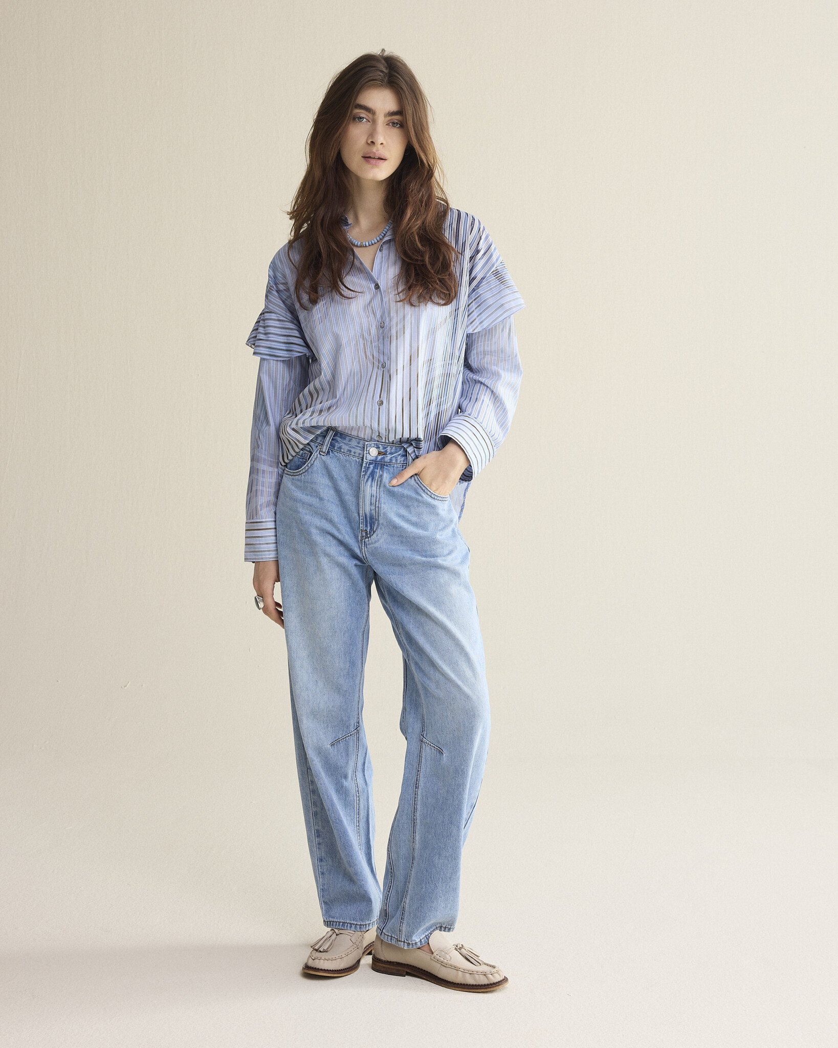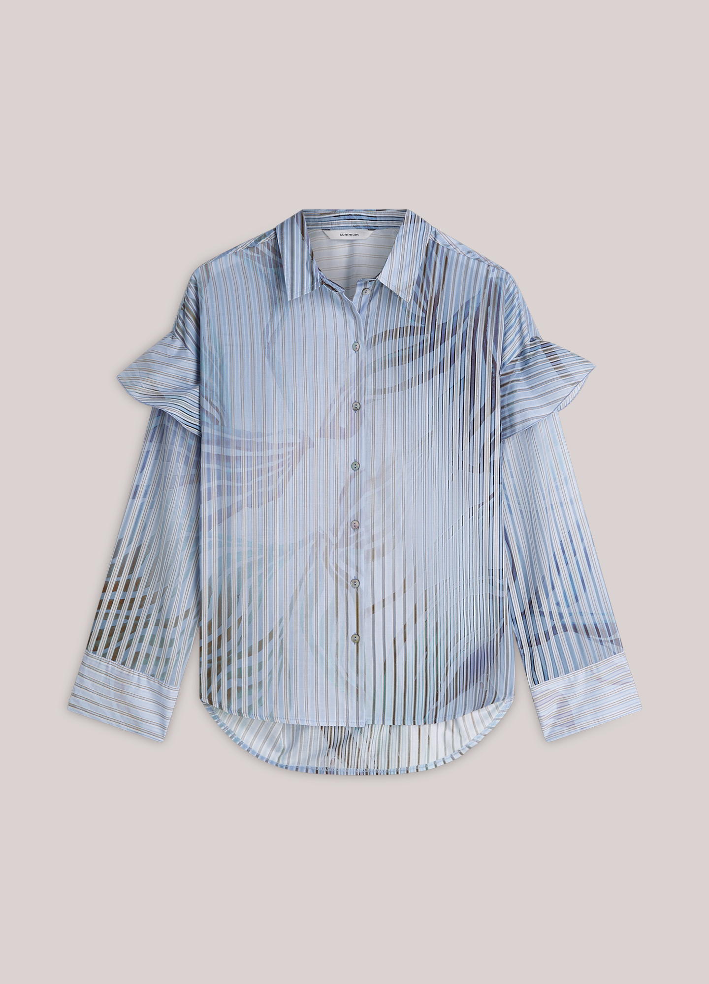 Blouse van gestreepte katoenen stof met een subtiel bladerpatroon. De blouse heeft een verlaagde schouder met ruches op de mouwaanzet en een wijde manchet met verstelbare dubbele knoopsluiting.