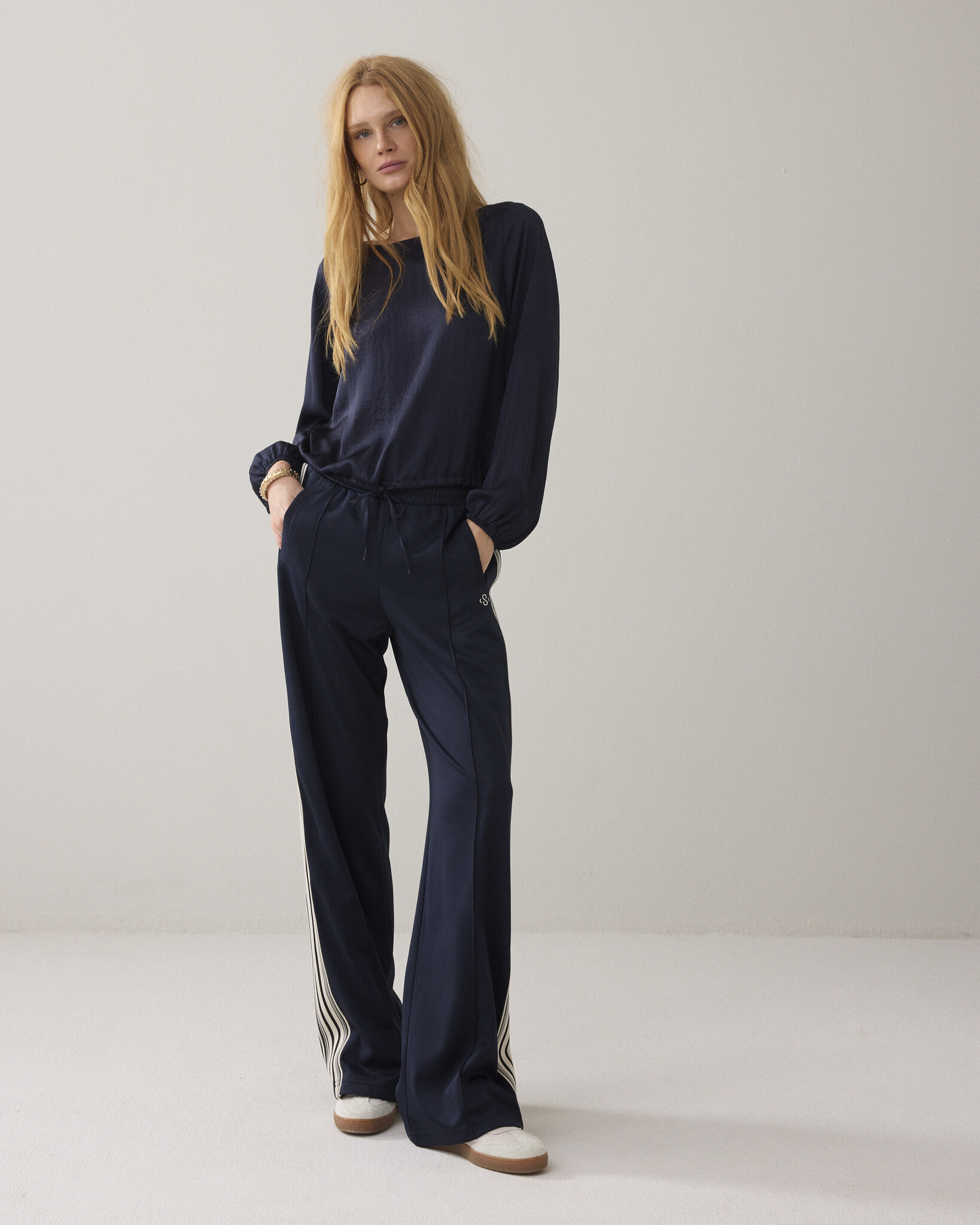 Top van gladde silky touch kwaliteit met een lichte glans. De blouse heeft een boothals met split en goudkleurig knoopje op de achterkant, aangeknipte mouwen met elastiek en een verstelbare zoom met stoffen koordje.