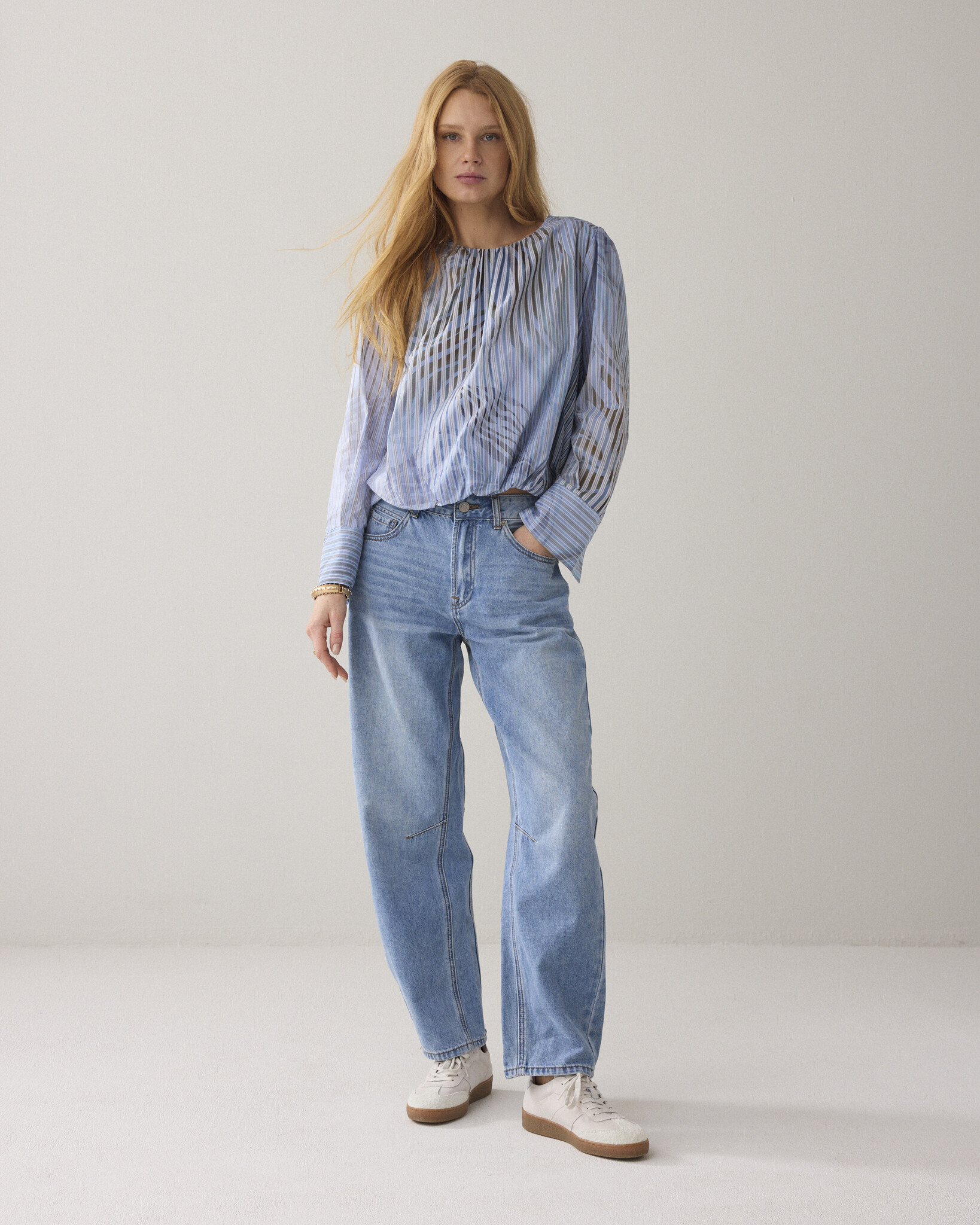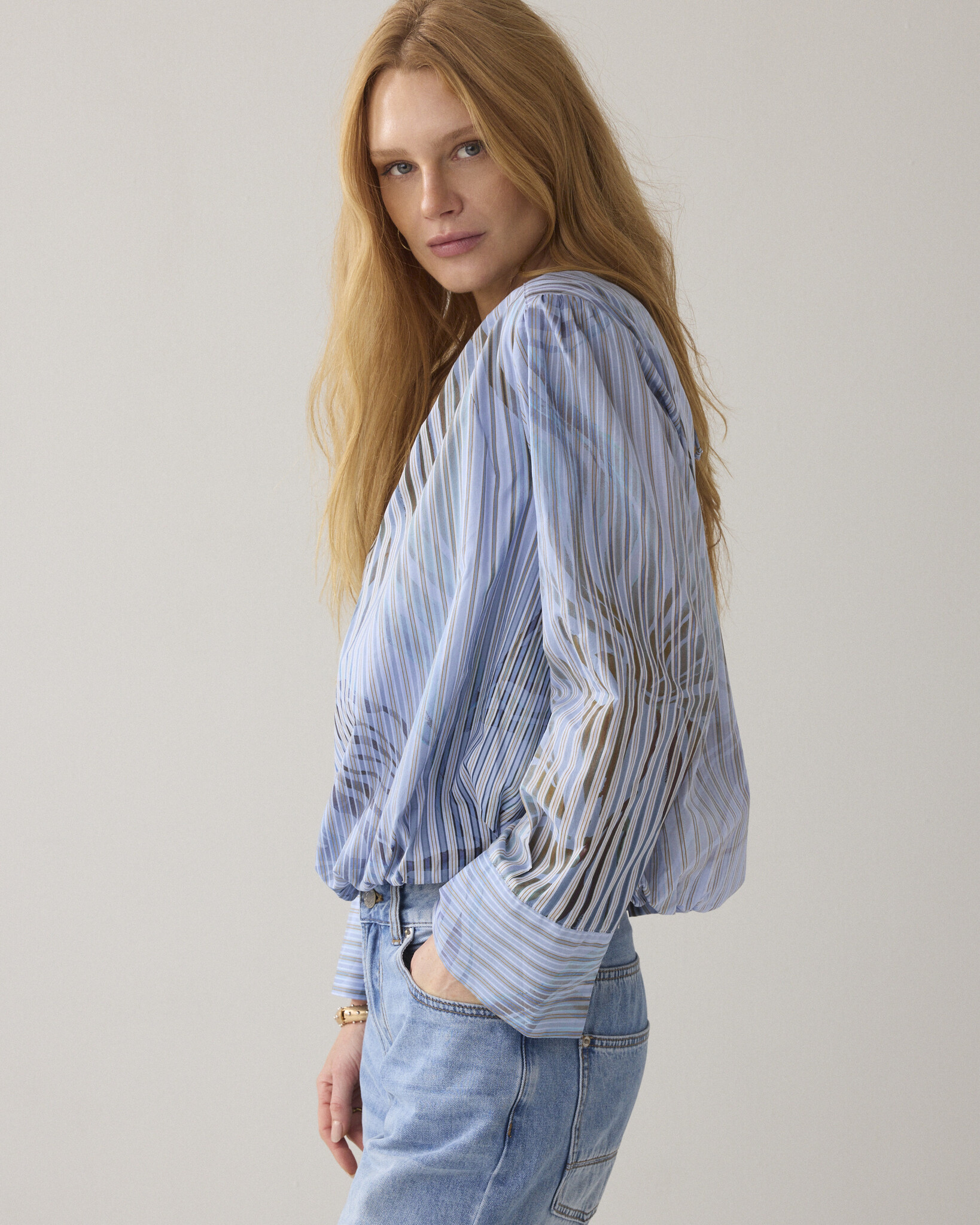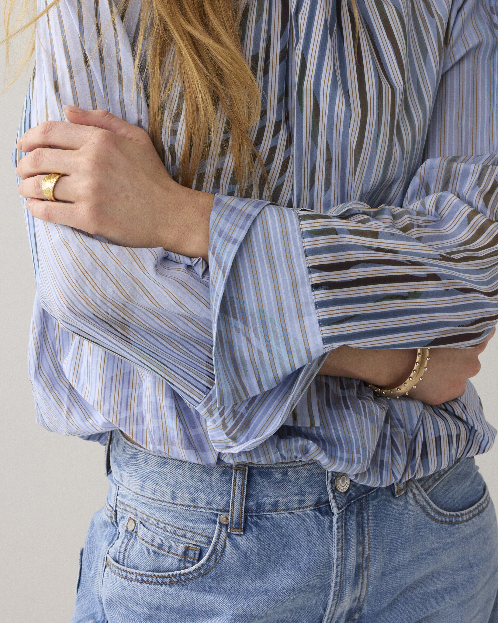 • Ongevoerde ballonmouwen met brede manchetten