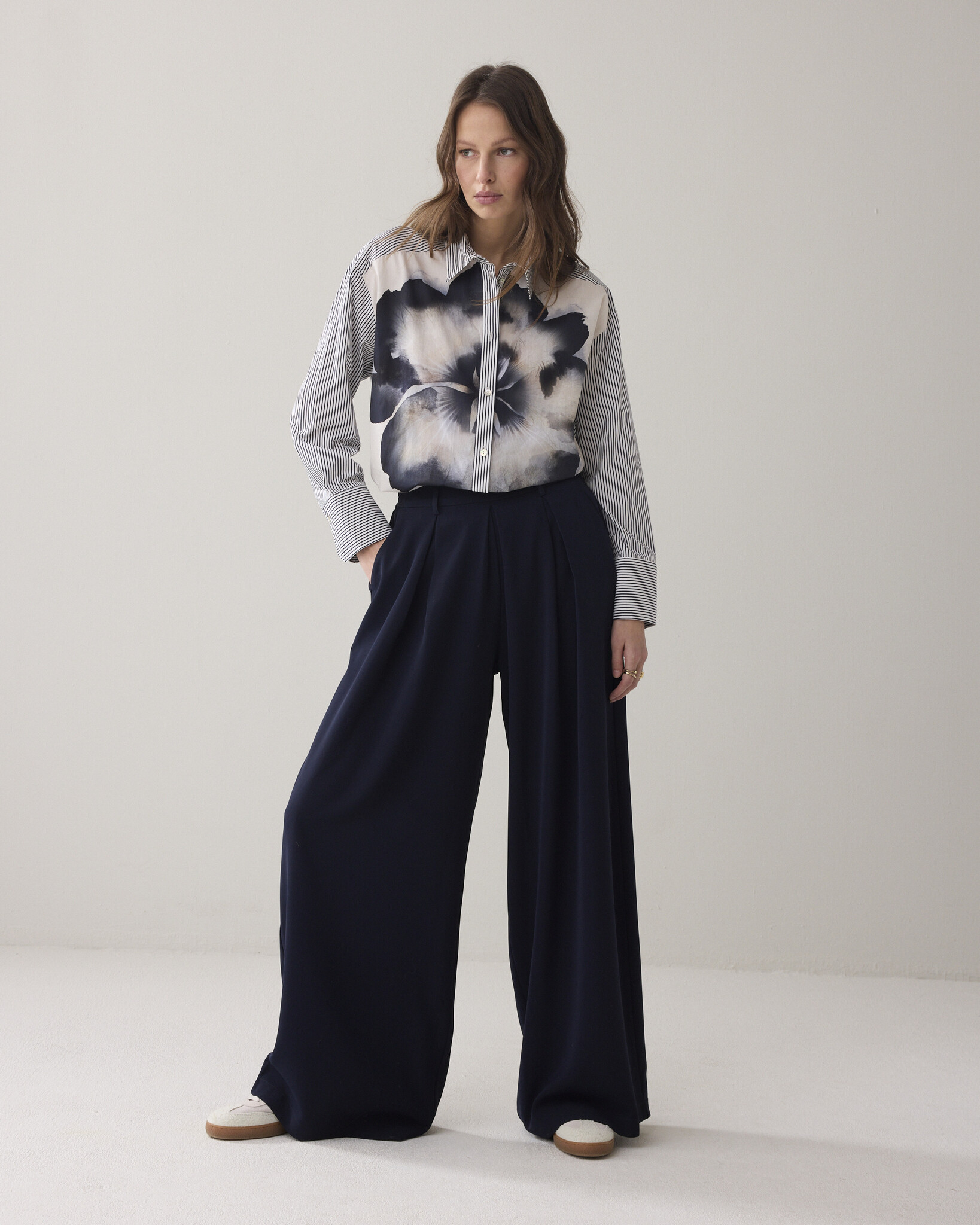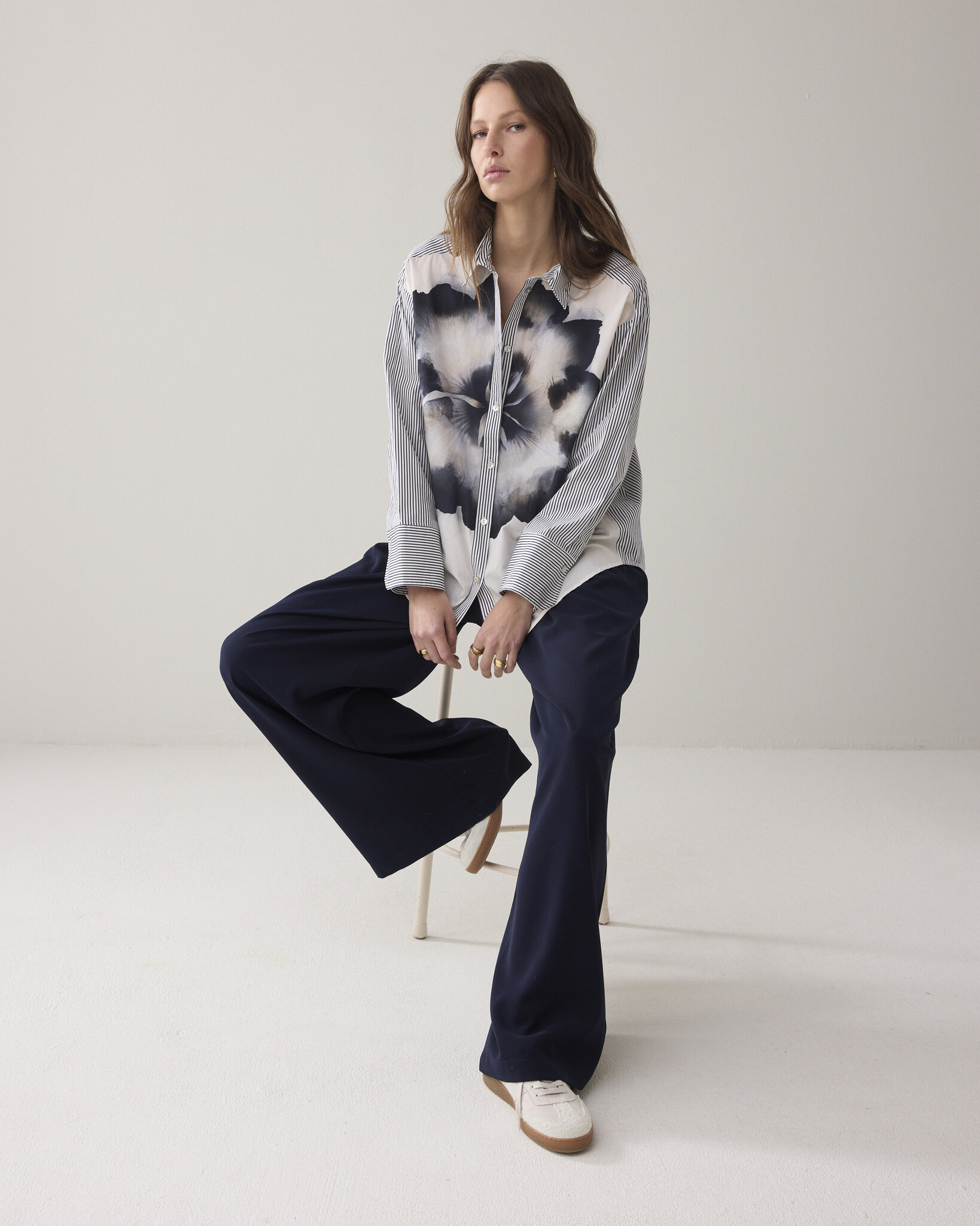 Deze ruimvallende overhemdblouse combineert een geprinte streep met een unieke bloemenprint. De blouse heeft een verlaagde schoudernaad en verstelbare manchetten.