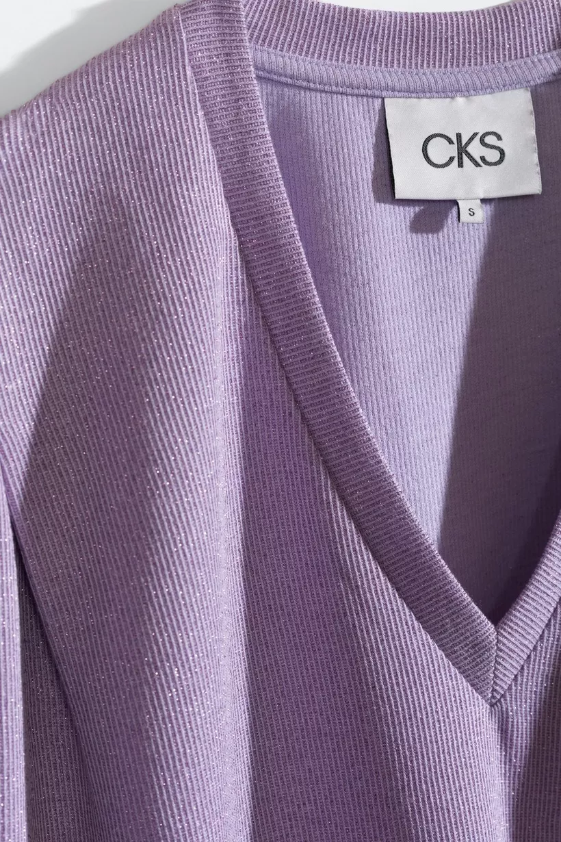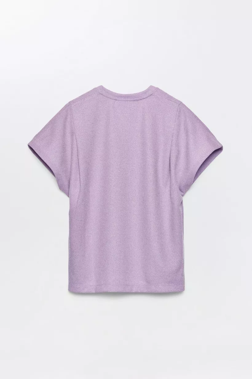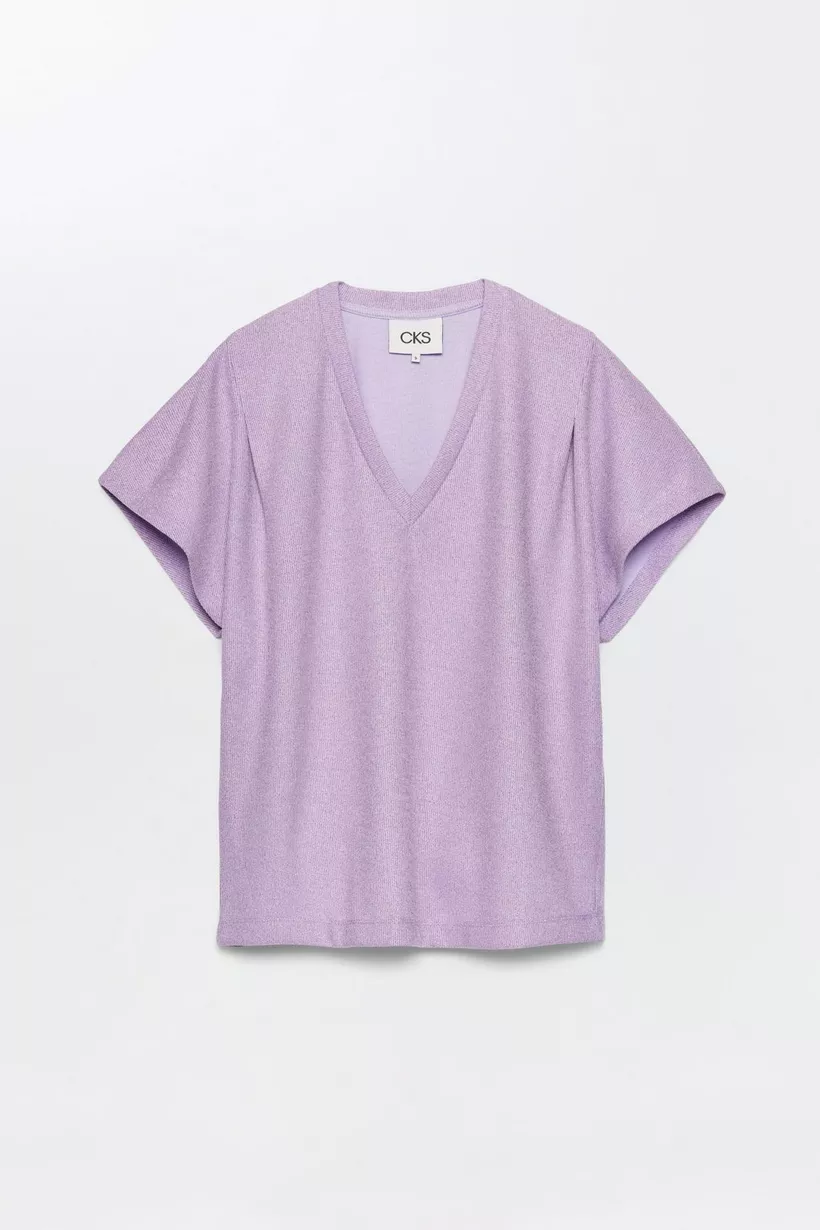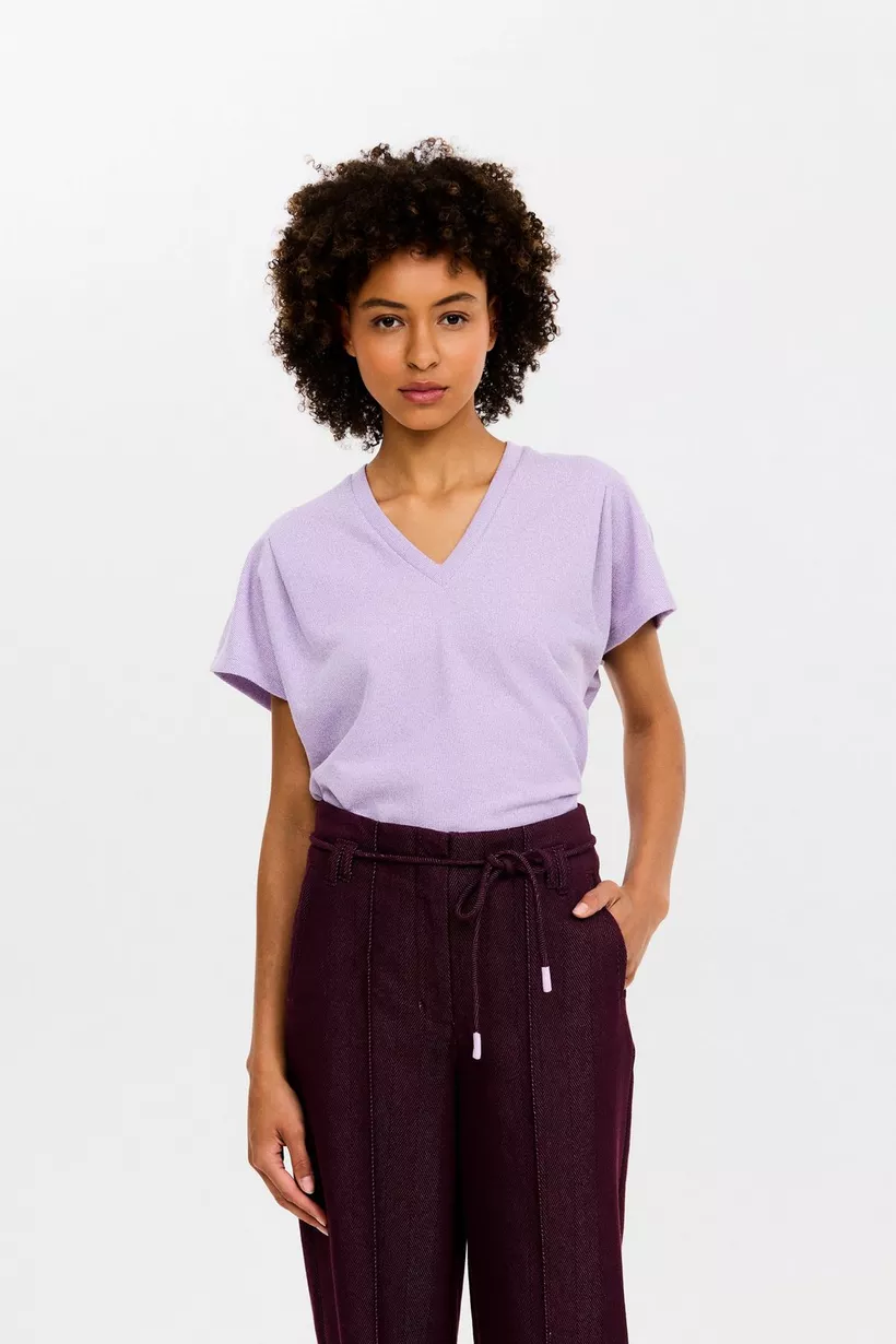 Lila T-shirt met korte mouwen voor dames ontworpen met een V-hals en een ribtextuur. Zoom in en spot de subtiele glitter die elke outfit van een feestelijke touch voorziet. Makkelijk te combineren met denim of een contrasterende of net neutrale kleur.