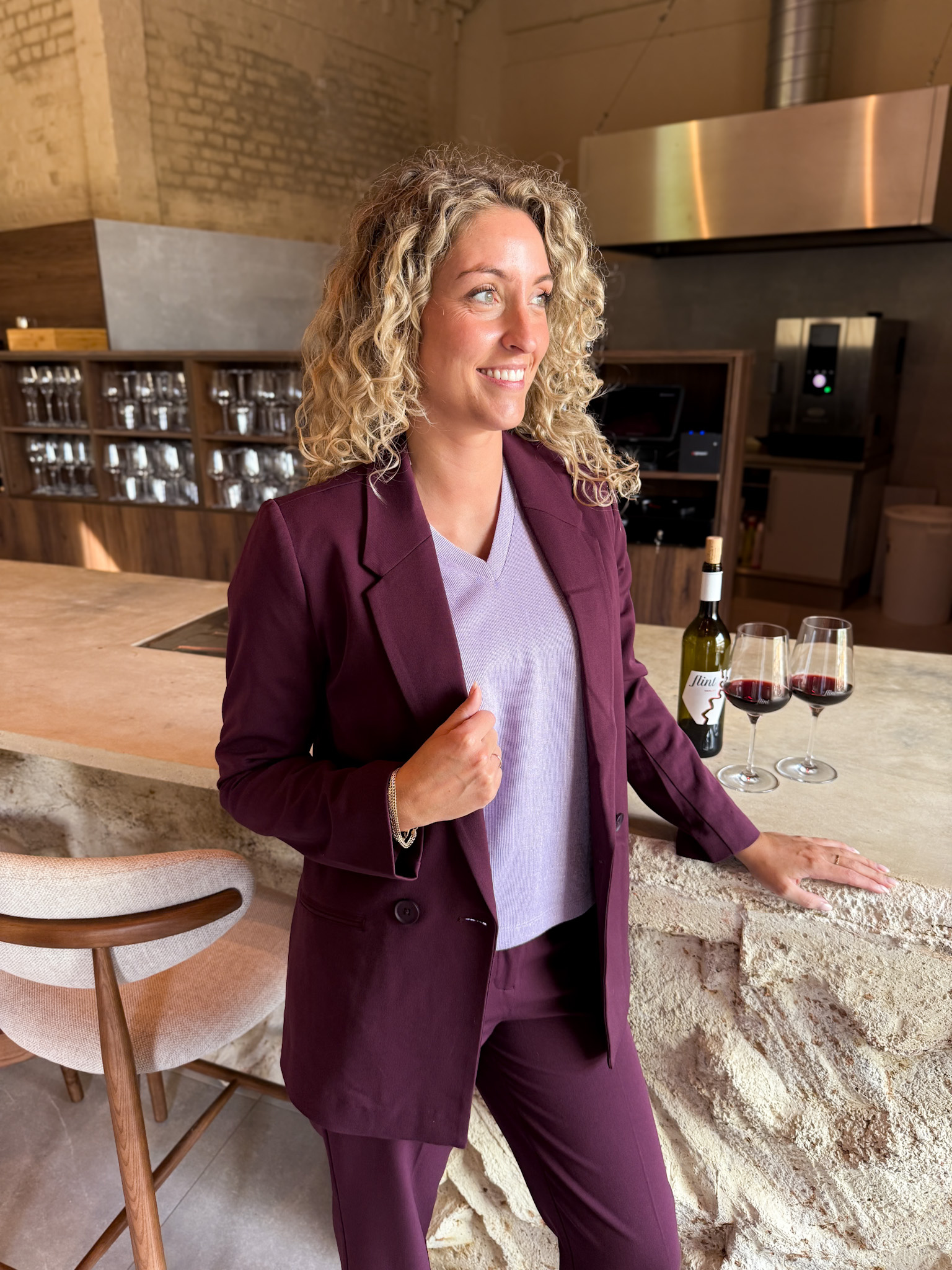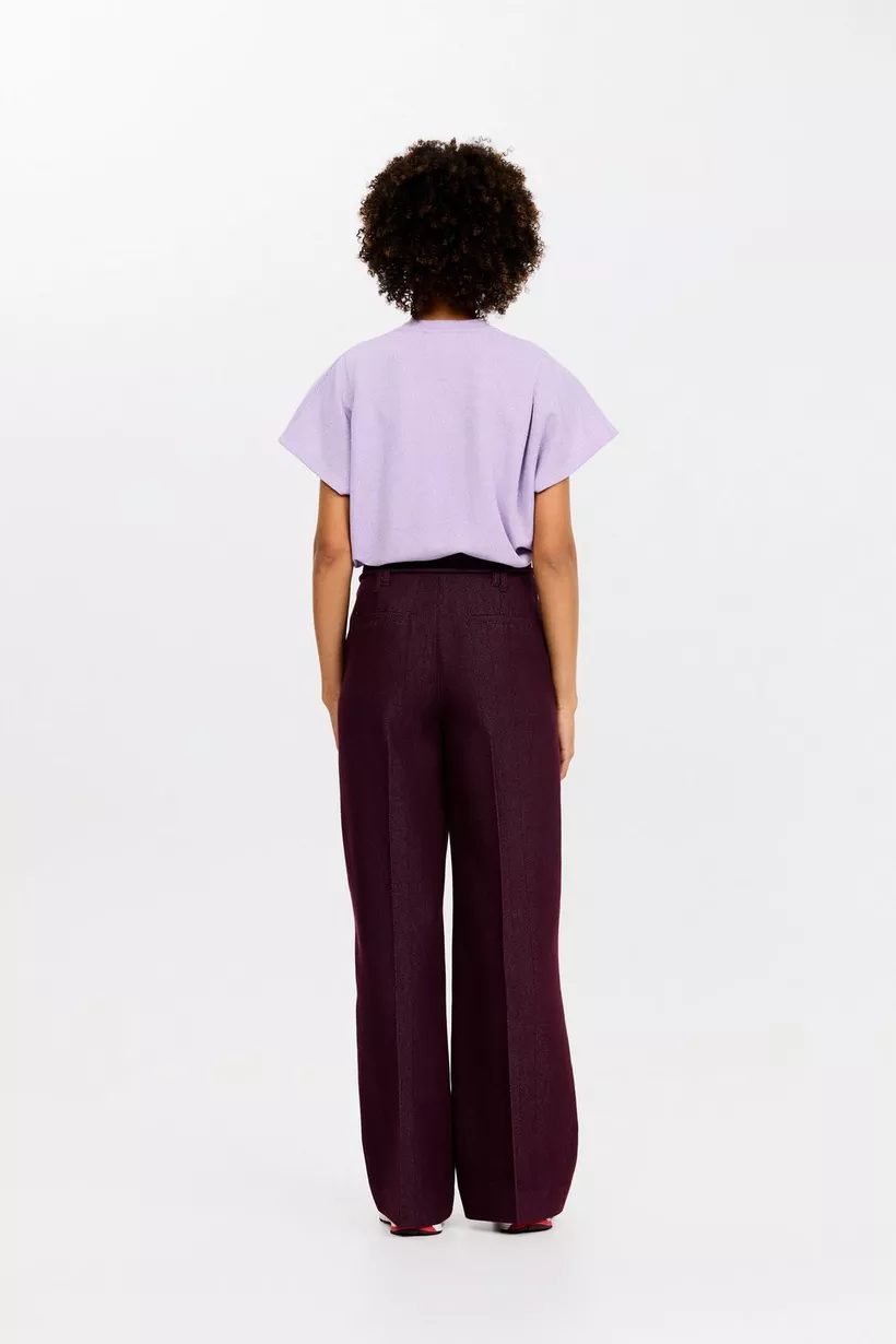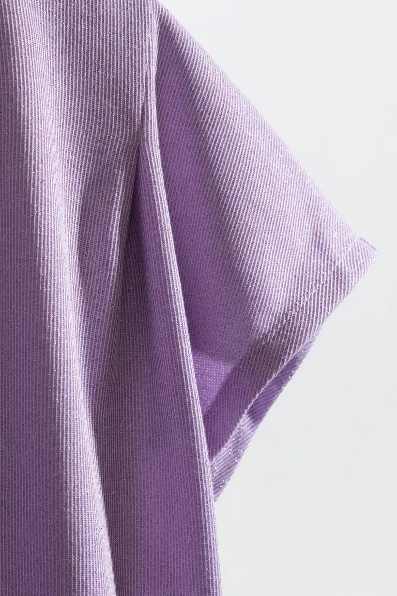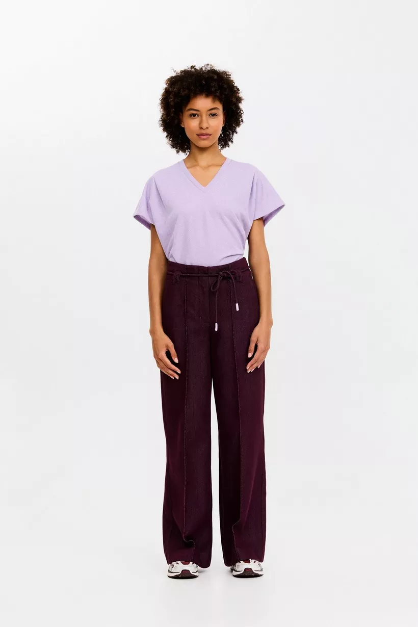 Lila T-shirt met korte mouwen voor dames ontworpen met een V-hals en een ribtextuur. Zoom in en spot de subtiele glitter die elke outfit van een feestelijke touch voorziet. Makkelijk te combineren met denim of een contrasterende of net neutrale kleur.