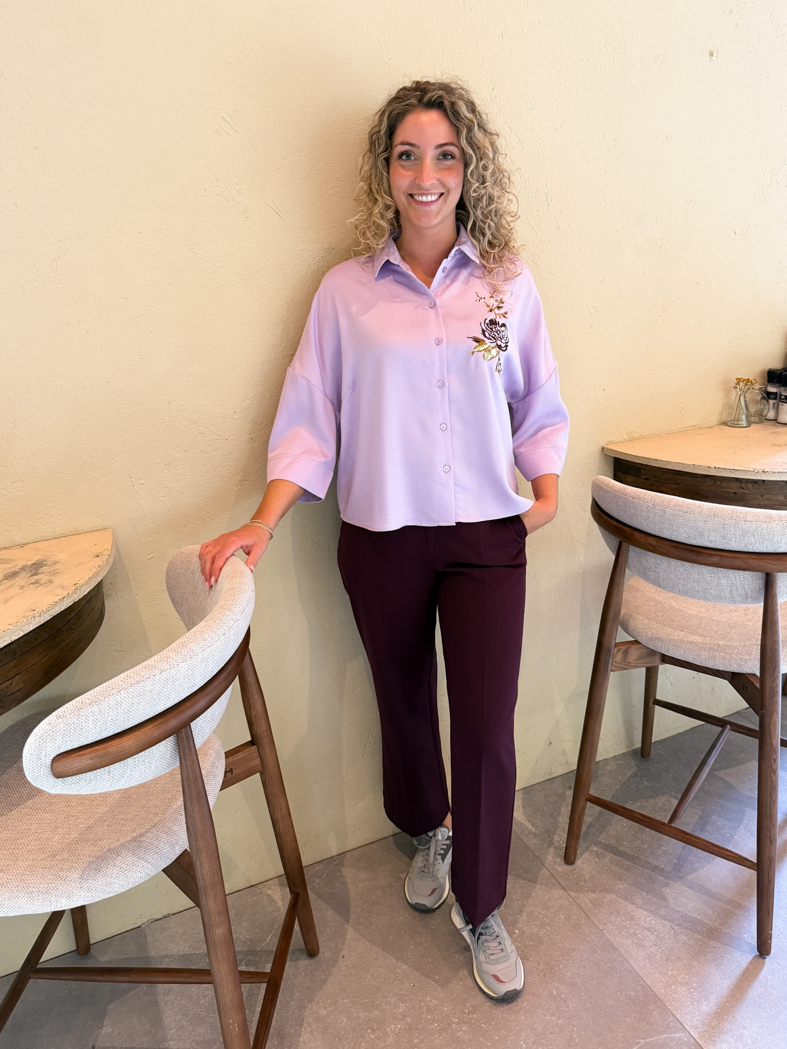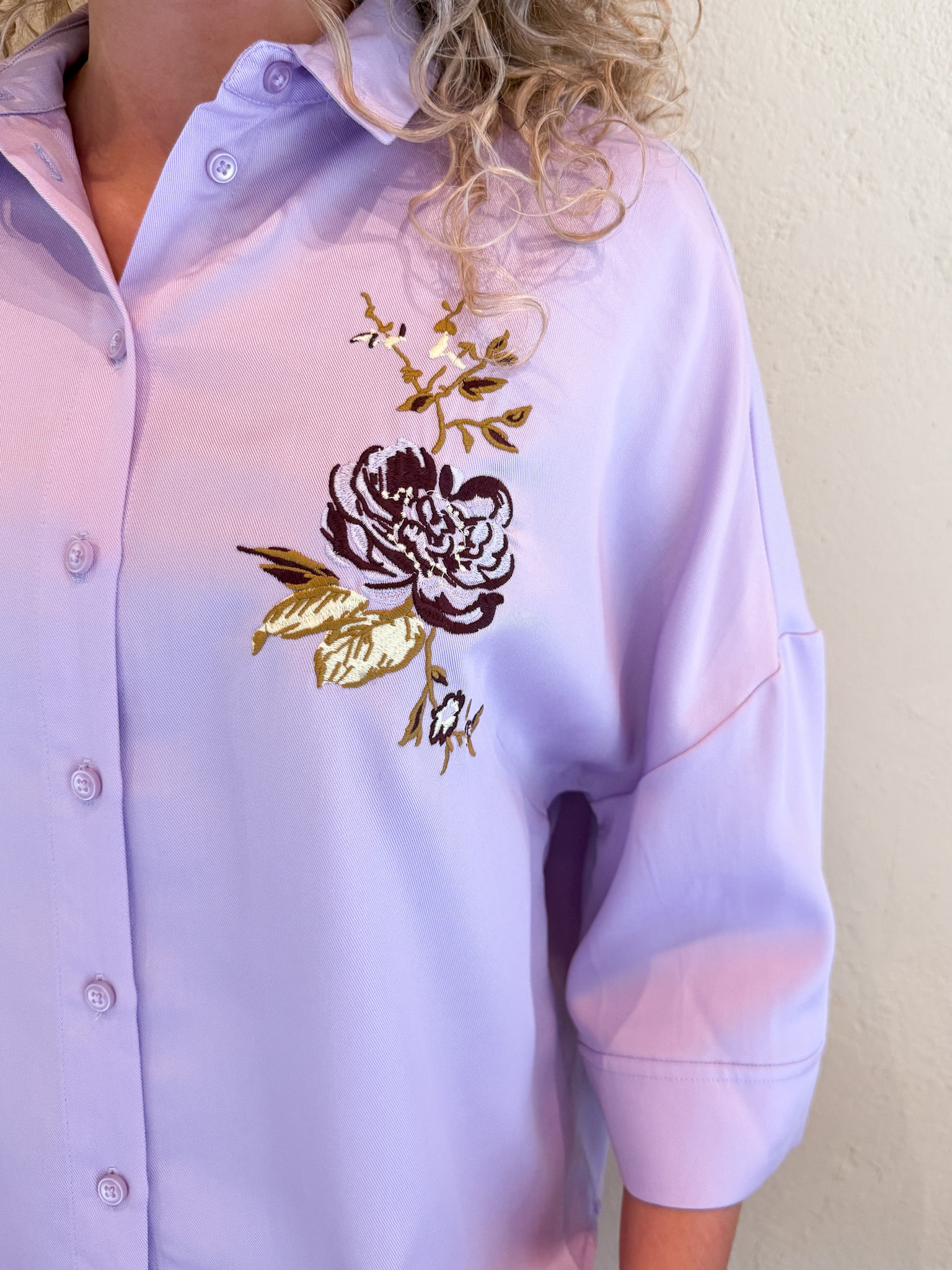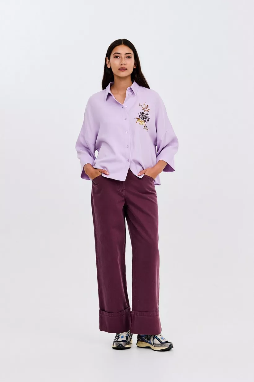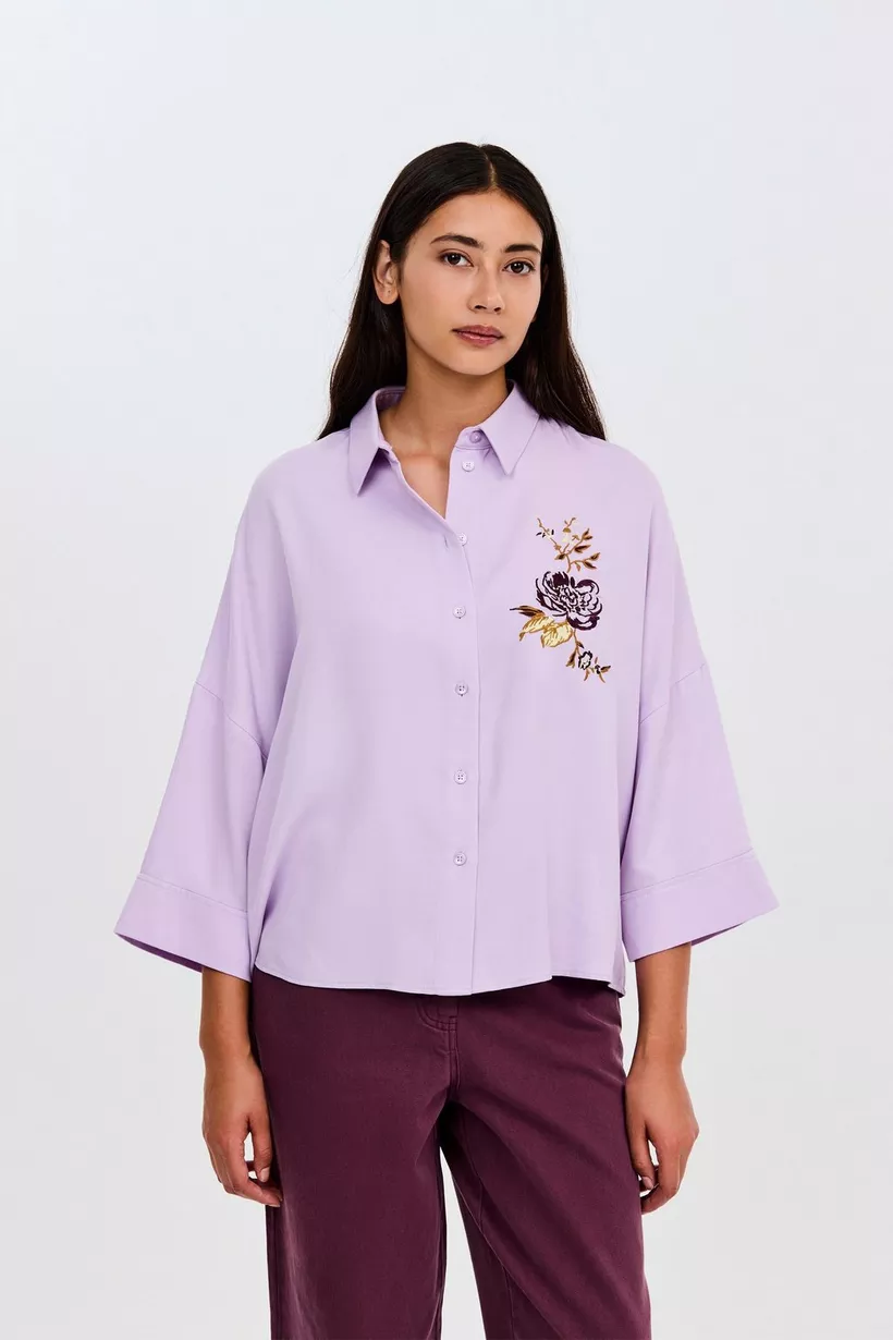 Details matter! De verfijnde, geborduurde bloem in paars, mosterdkleur en lichtgeel verdient alle aandacht bij deze blouse voor dames. Dit lila item heeft een hemdkraag en wijde, laag ingezette mouwen. Gemaakt uit 100% TENCEL™ Lyocell.