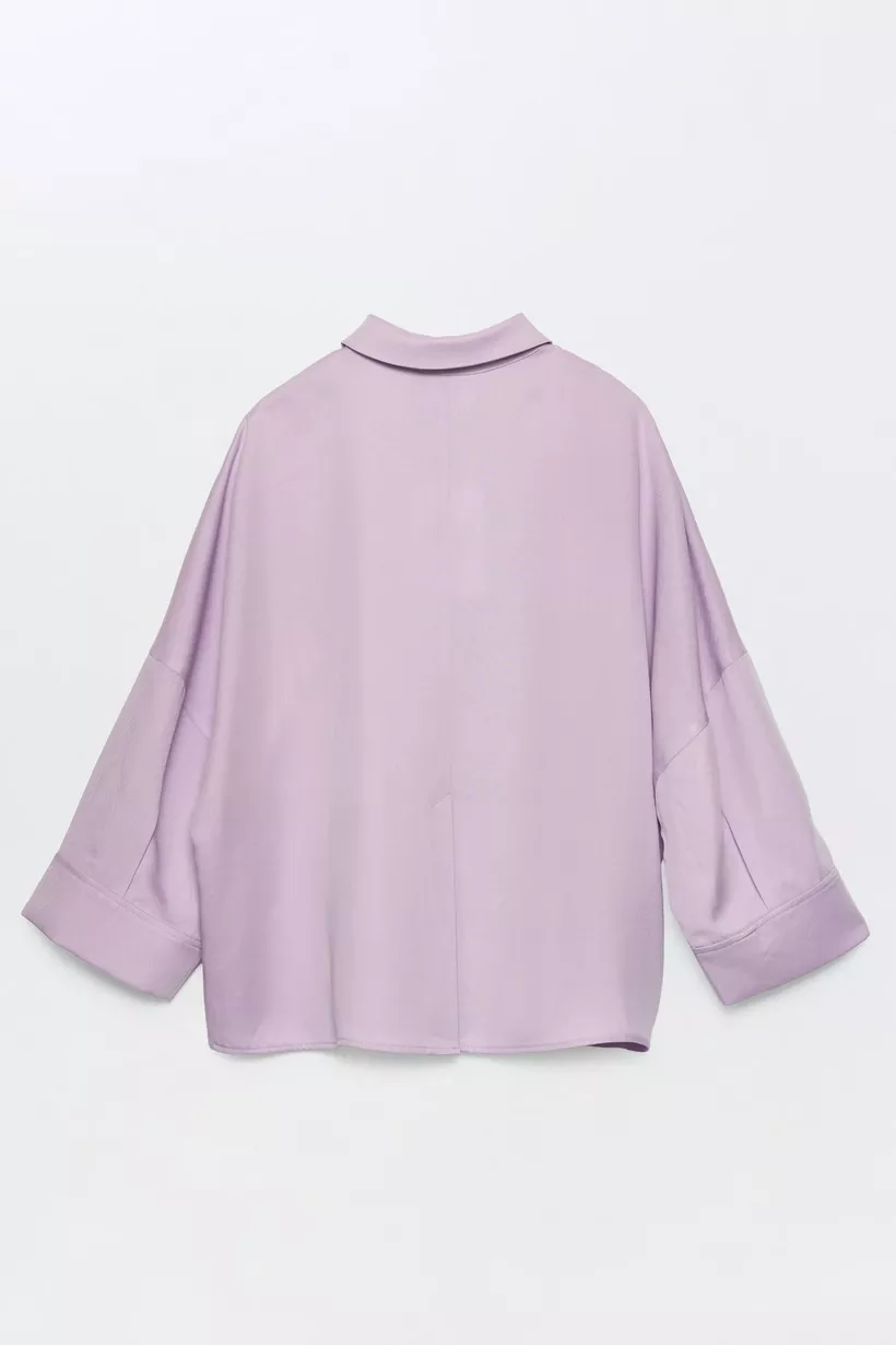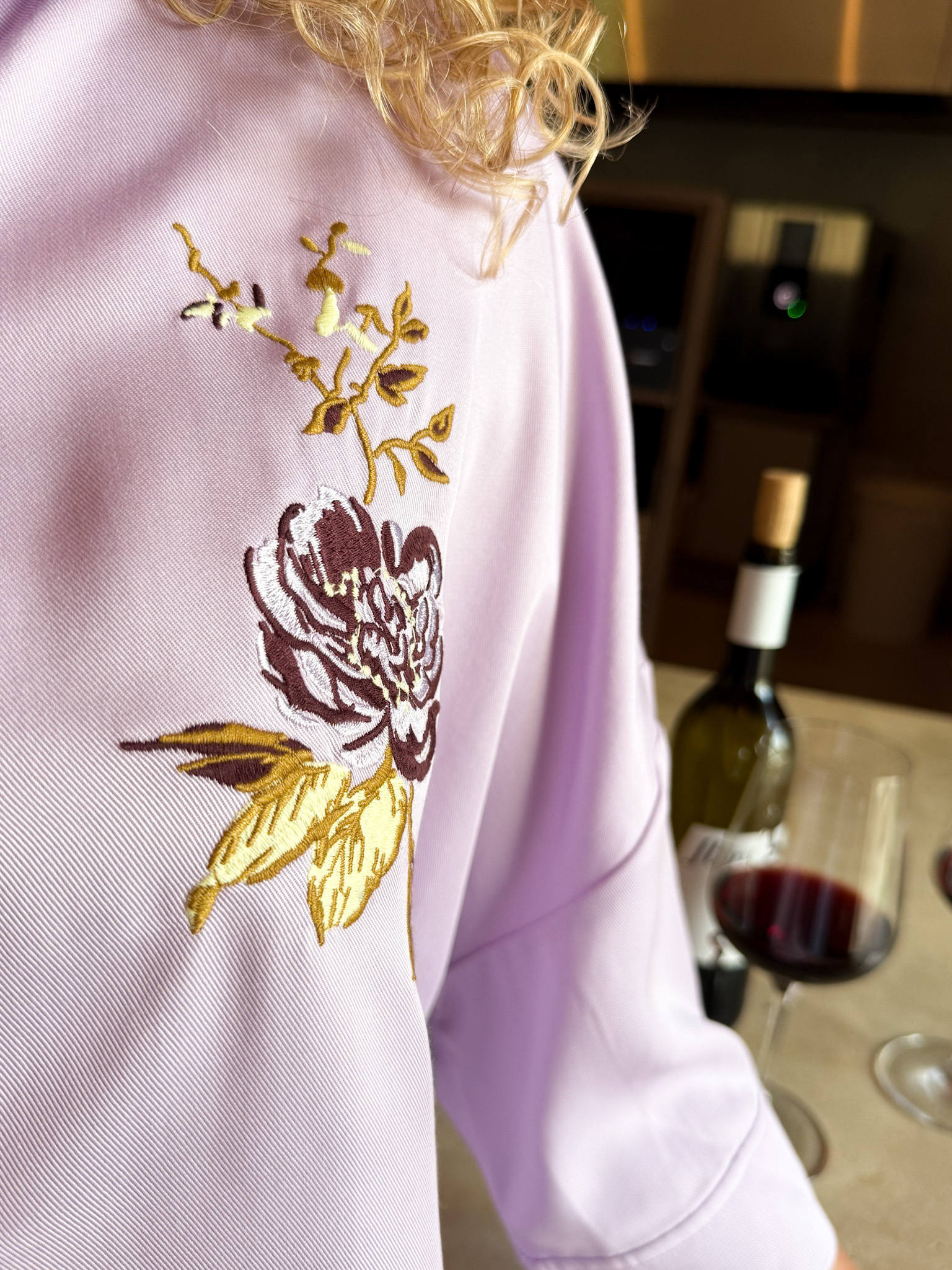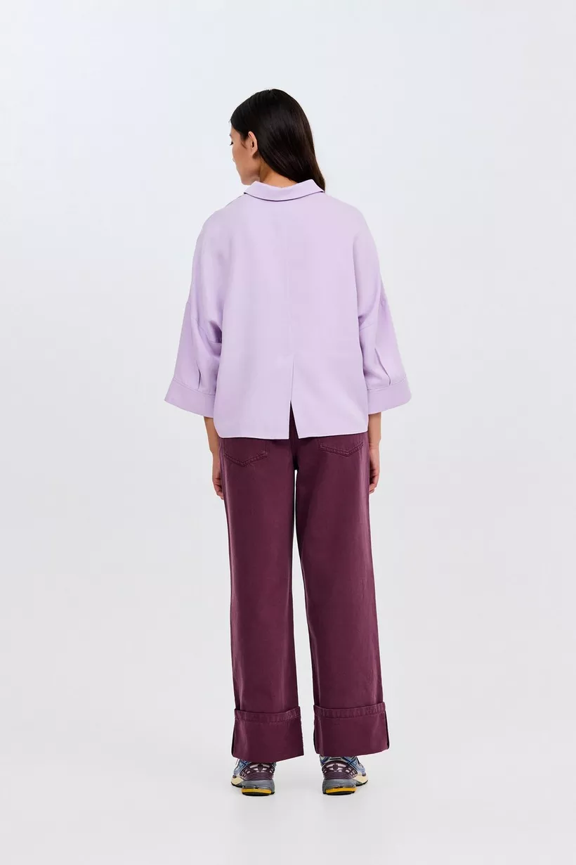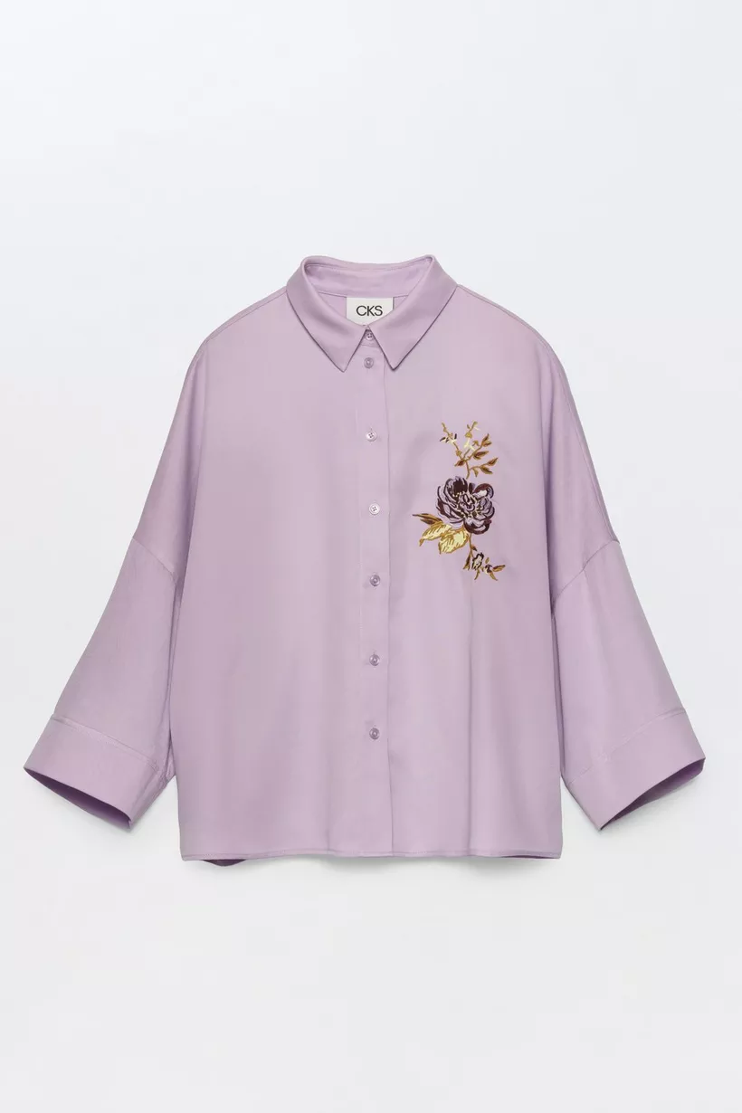 Details matter! De verfijnde, geborduurde bloem in paars, mosterdkleur en lichtgeel verdient alle aandacht bij deze blouse voor dames. Dit lila item heeft een hemdkraag en wijde, laag ingezette mouwen. Gemaakt uit 100% TENCEL™ Lyocell.