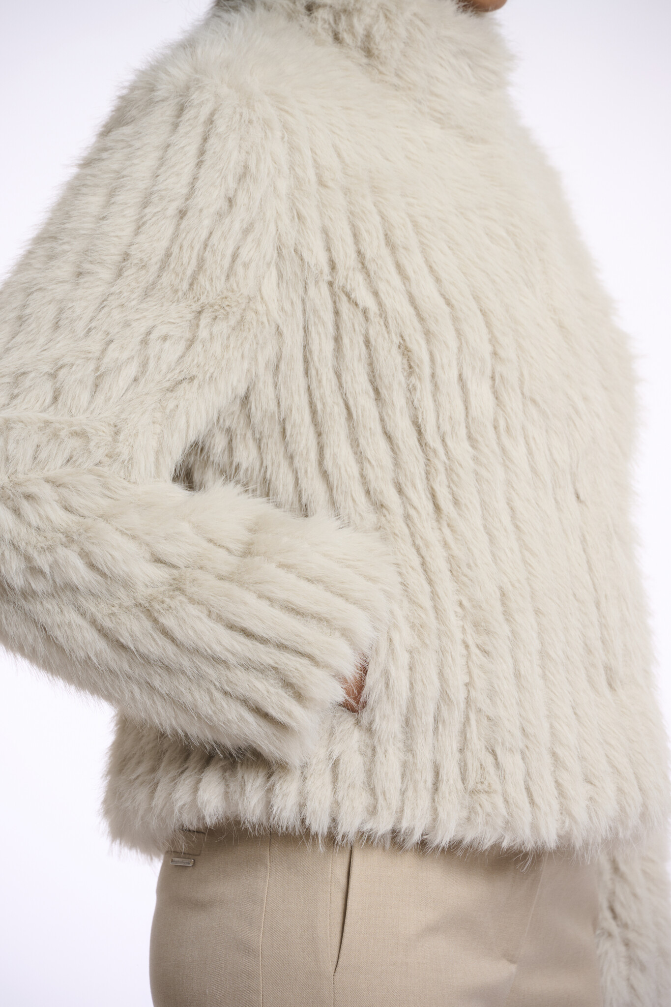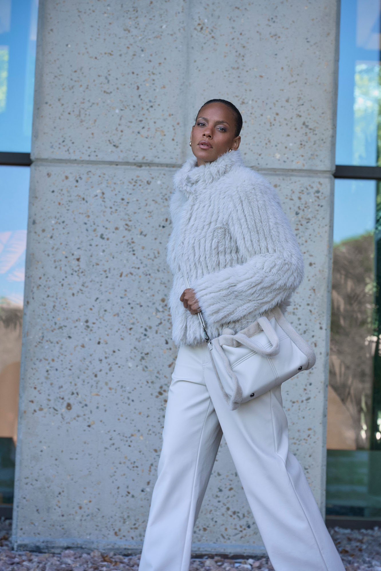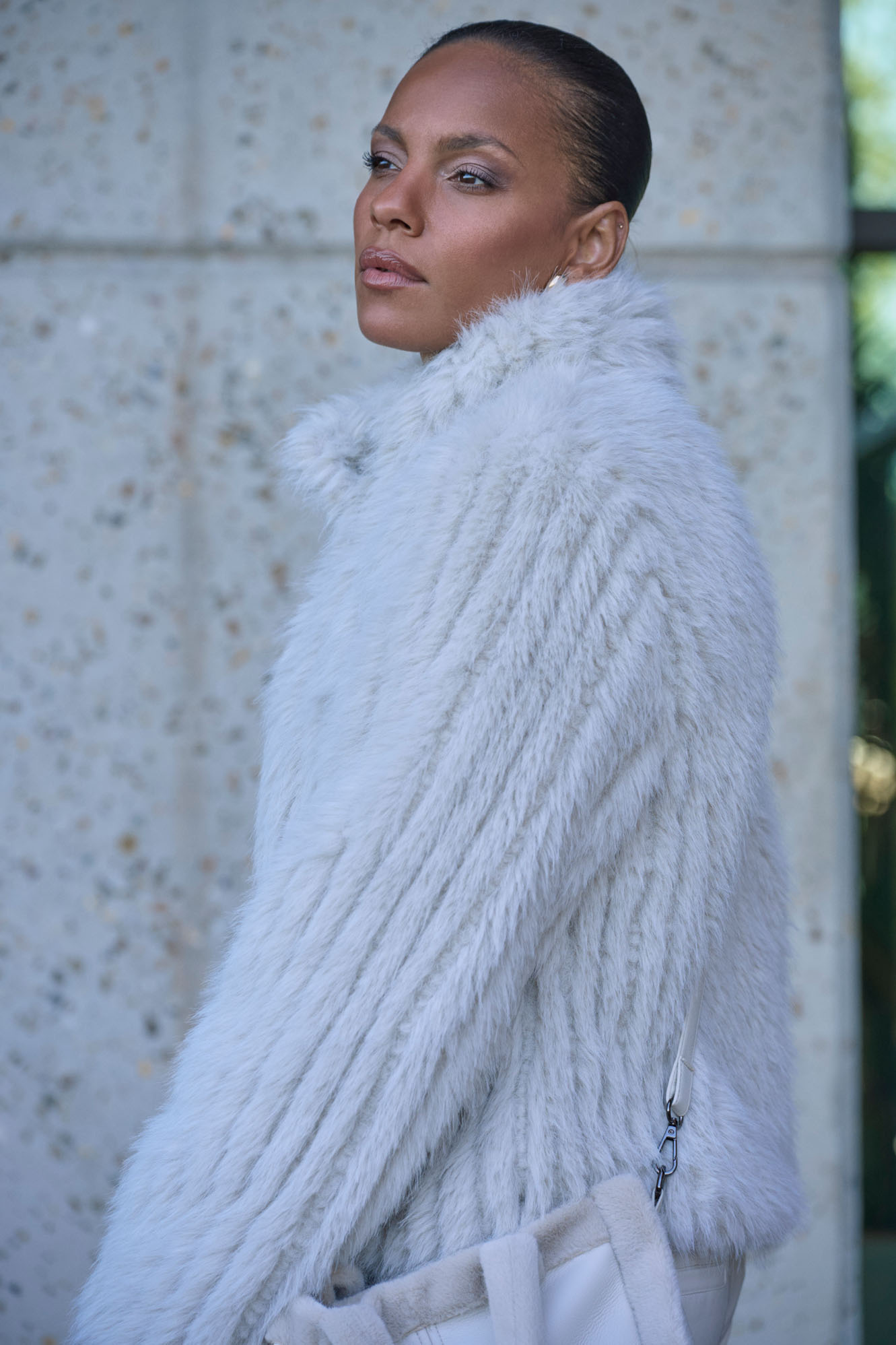 Wrap yourself in the luxurious softness of this short faux fur jacket. Designed with a sleek push button closure, a stand-up collar, convenient side slit pockets and a bold striped design for a visually stunning effect, this jacket makes a fashionable statement wherever you go.