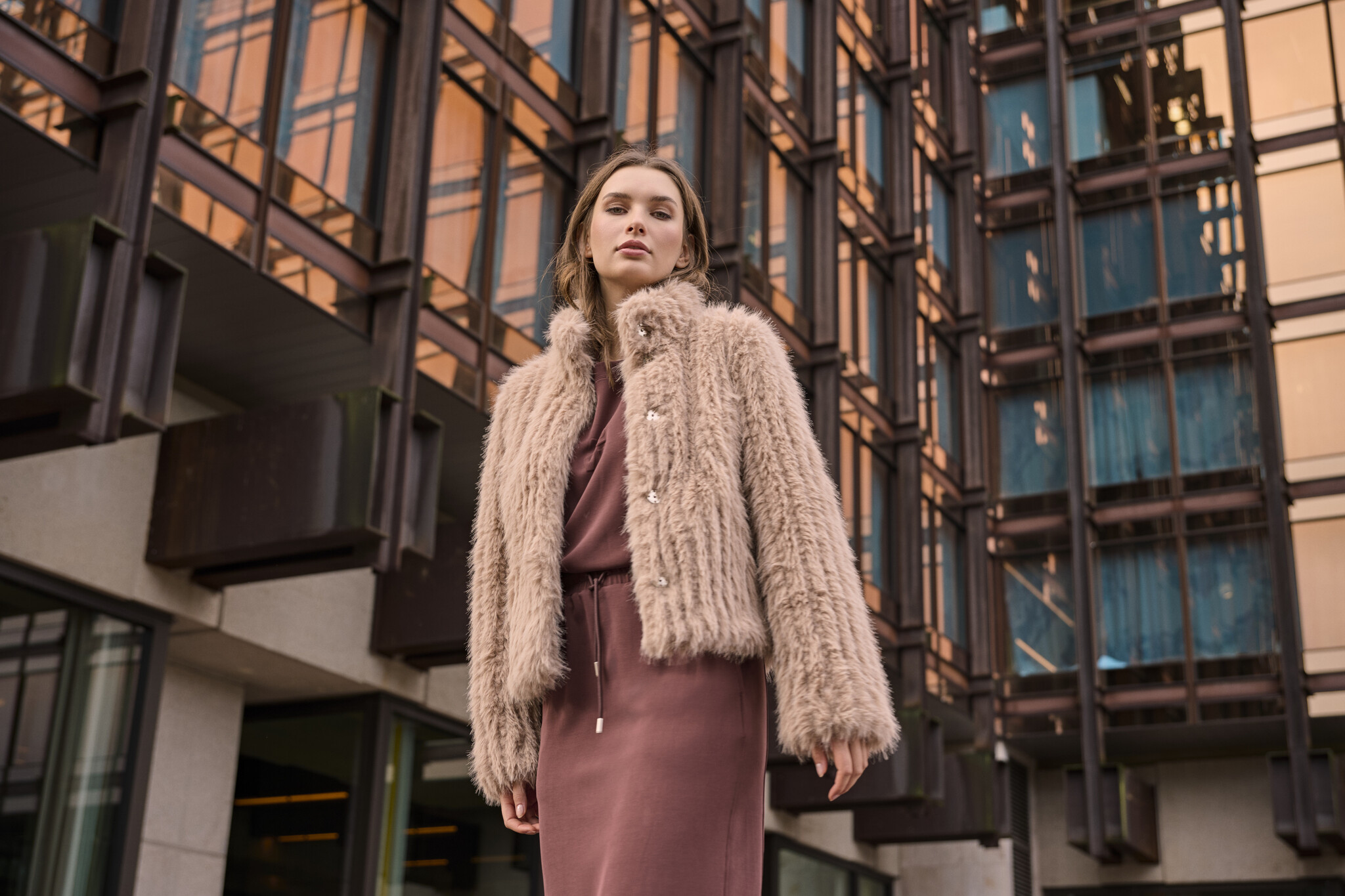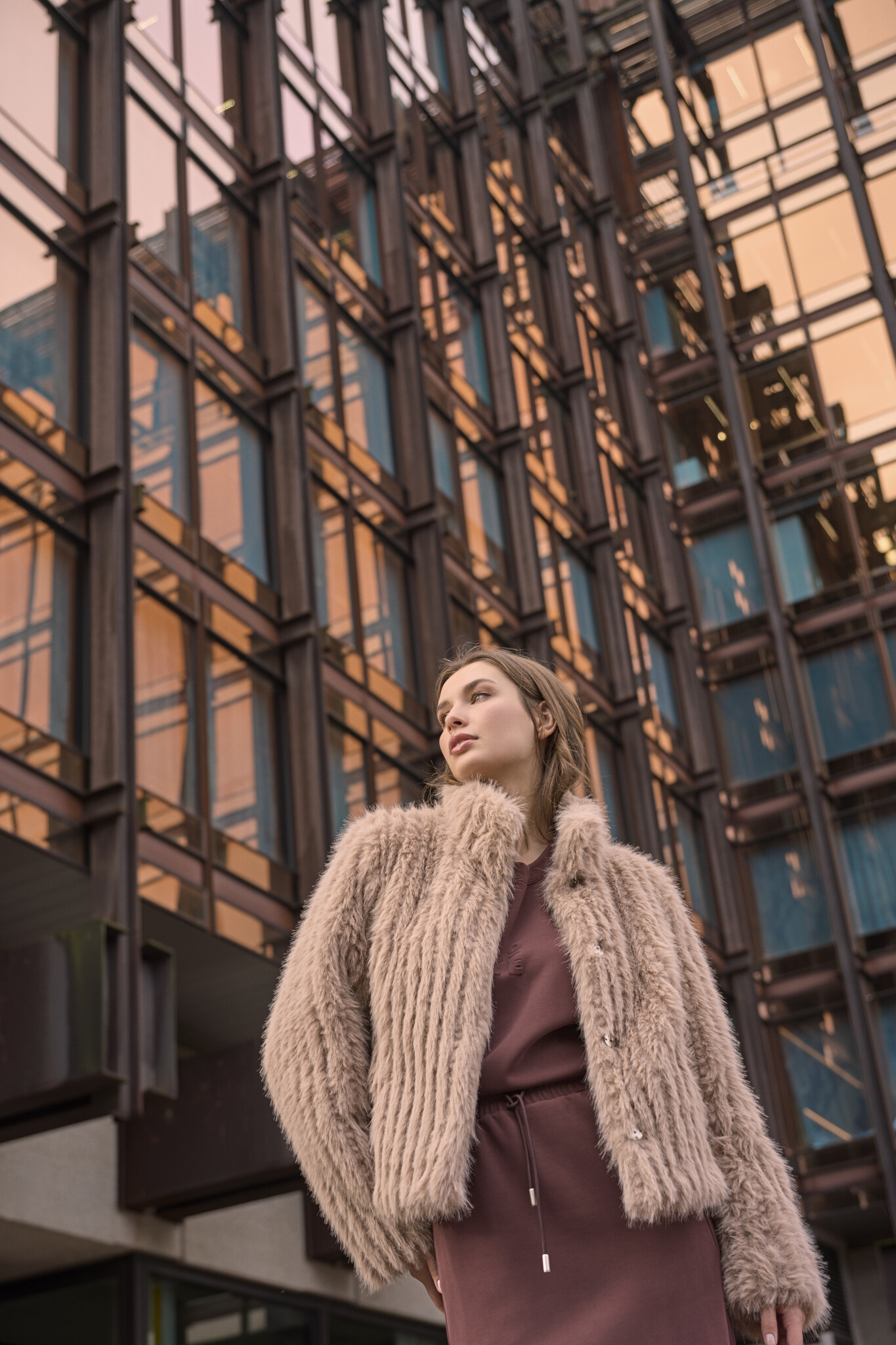 Wrap yourself in the luxurious softness of this short faux fur jacket. Designed with a sleek push button closure, a stand-up collar, convenient side slit pockets and a bold striped design for a visually stunning effect, this jacket makes a fashionable statement wherever you go.