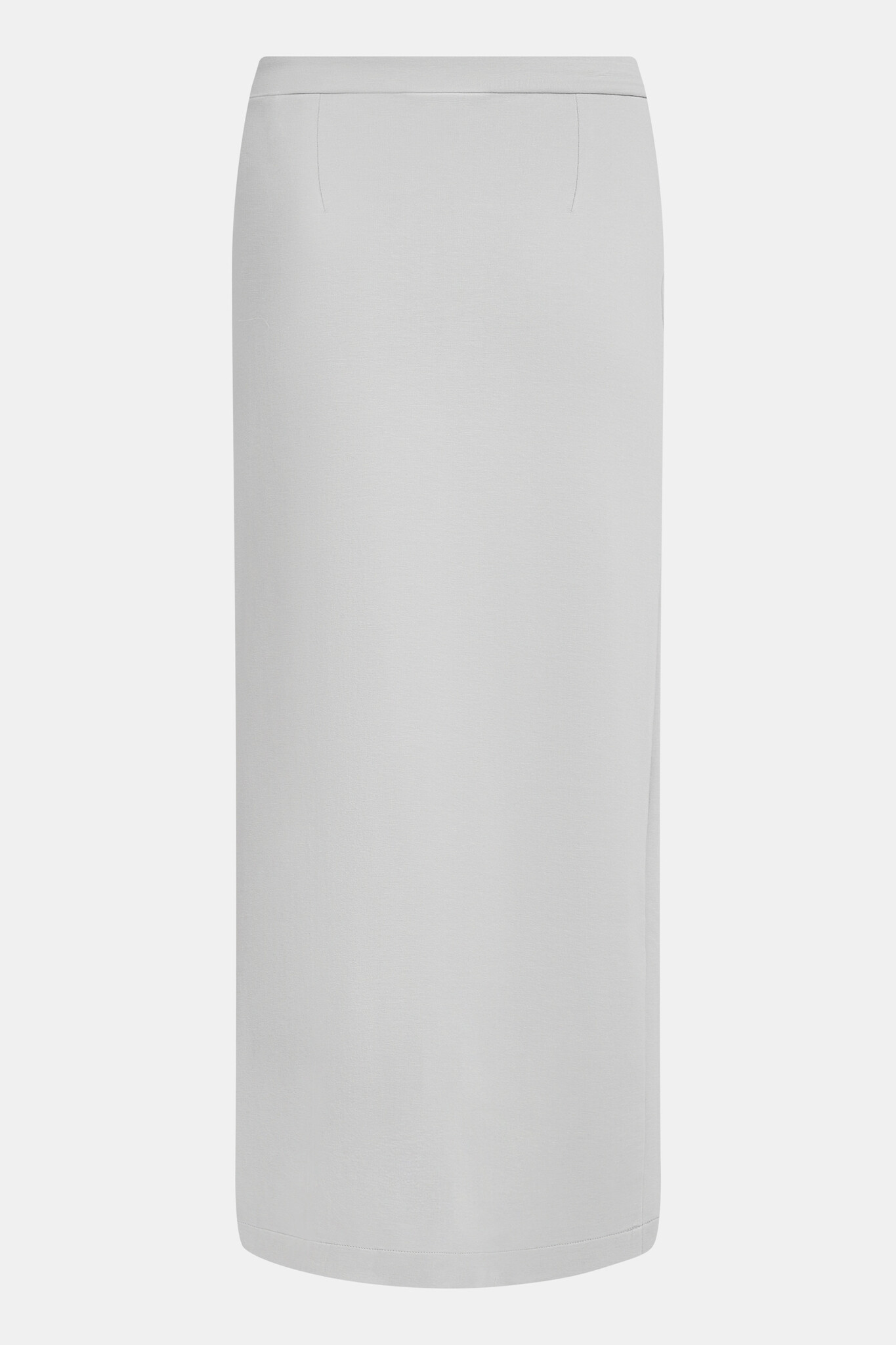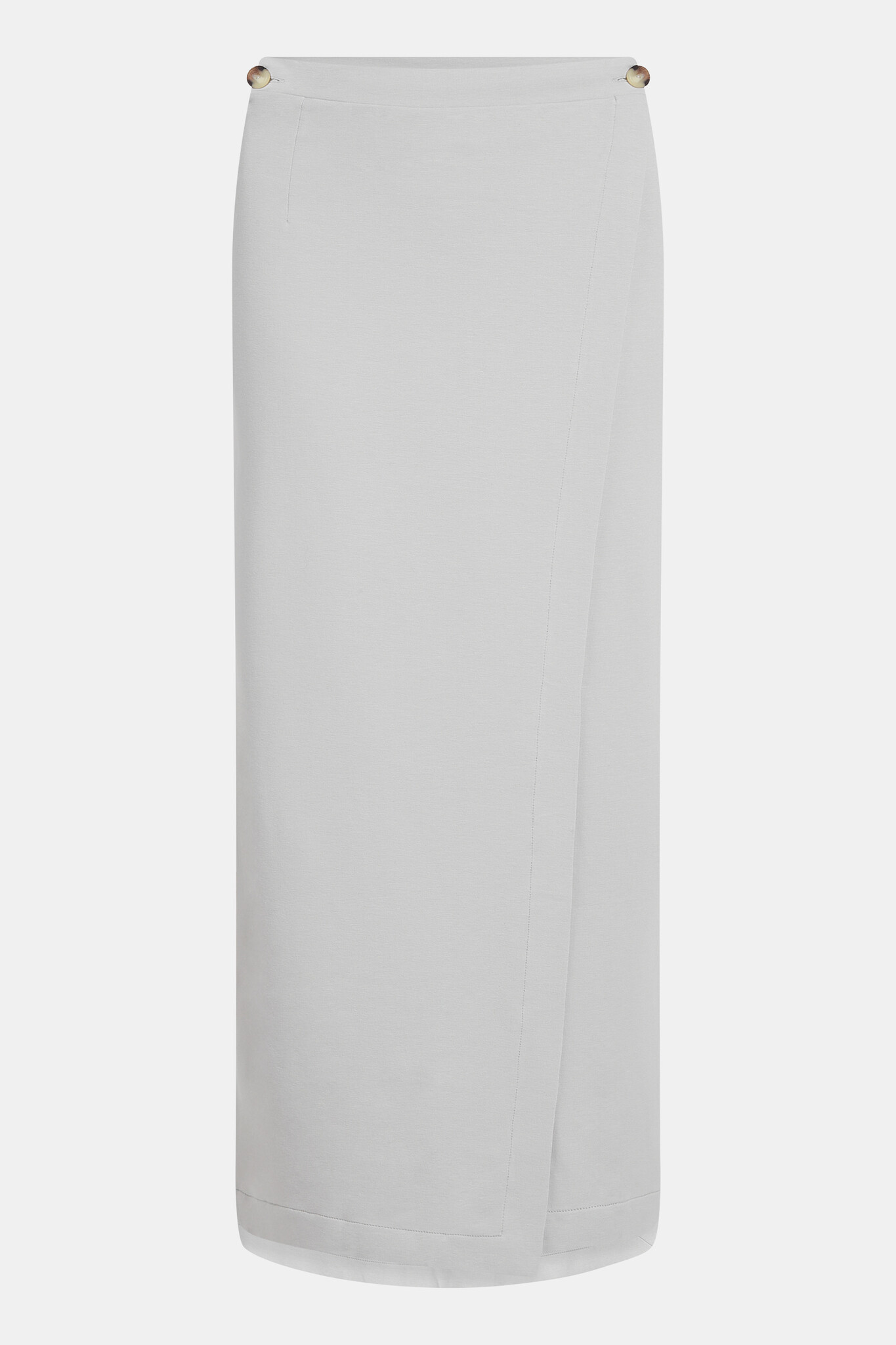 Deze elegante midirok is ontworpen met een strakke, rechte silhouet dat moeiteloos flatteert. Subtiele knoopdetails aan de tailleband voegen een modern accent toe, waardoor deze rok gemakkelijk te stylen is, van casual tot meer verfijnde gelegenheden.